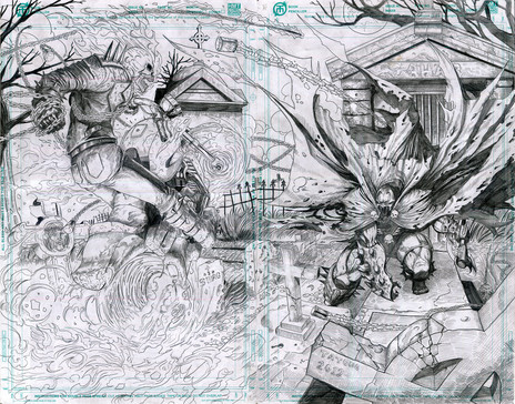 This drawing is very dynamic and very well composed, and that's a tough balance. Everything really popping out at you -- this would make an awesome cover.
