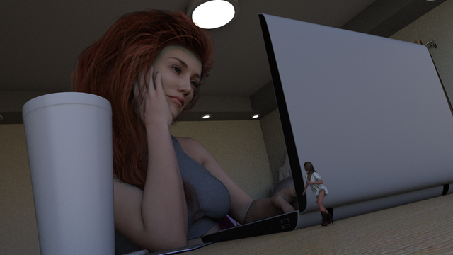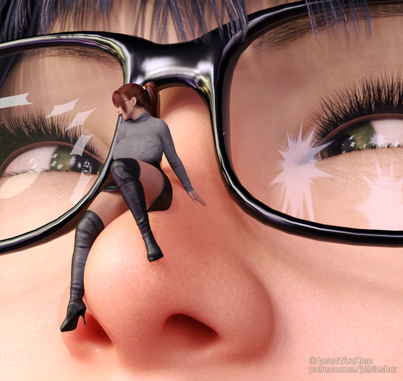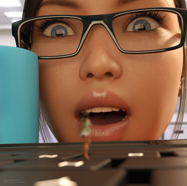 I love the confrontation between a tiny person on the edge of a table and a massive, huge woman's face coming down to meet them. That's one of those scenes I find so exciting. As always, your artwork is magnificent.