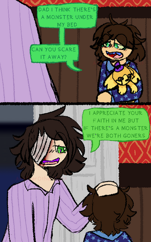 Evan (crying child) has a hard time sleeping thanks to his nightmares, so Moon or Micheal will often stay up with him at night either till the morning, or till he falls asleep