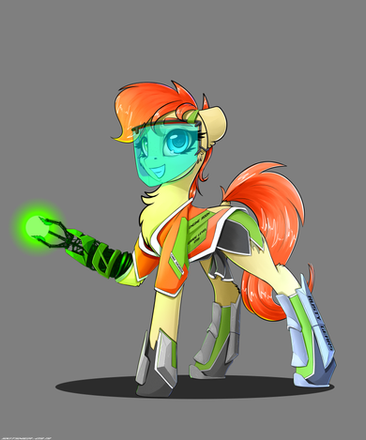 For some reason, Applejack seems to be the pony most often drawn with cyborg/prosthetic parts, robotic or steam-powered. I wonder why that is. My theory is that fans consider her to be one of, if not the, most likely of the mane six to need them, what with the farm labor and aggressive nature. I'd say Rainbow Dash would be a very close second, for reasons which should be obvious.