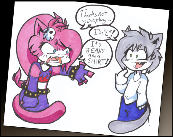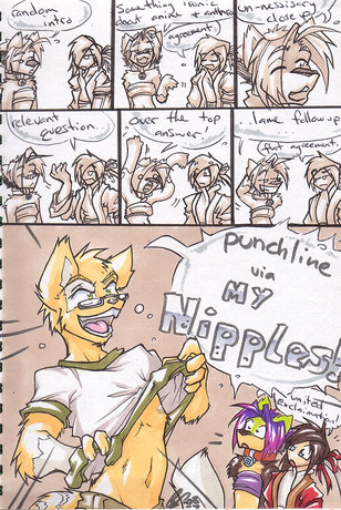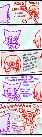 Haw haw it's a boobies related joke. So an online friend of mine has a new Sonic fancharacter, and when I was helping designing her she wanted to have her merely wearing a ribbon for her "top", and this joke sort of came about from some random doodles on MSN, which she demanded I make into a comic. So here it is, huzzah.JezMM (c) Me