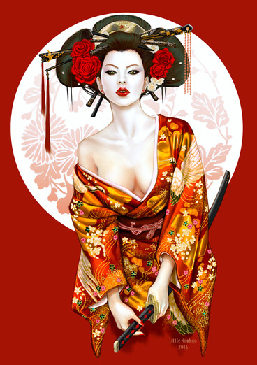 I don't mean to be moany, but she isn't a geisha because her obi(sash) is tied at the back, showing she is a courtesan. A geishas obi would be at the front. Great artwork though! I love her eyes.