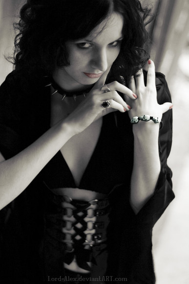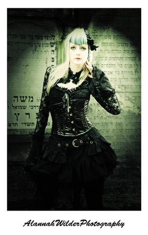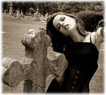 Once again, great outfit! I loe her pose, facial expression, graveyard background, and roses. What's that in her hand? Kind of reminds me of a witch doing some sorcery (a good witch lol)