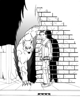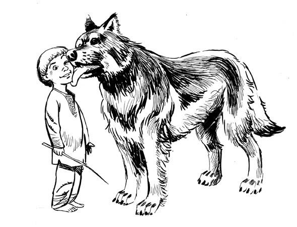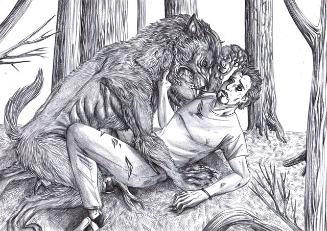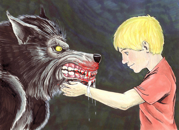 I like the way the two characters are opposites. The wolf looking angry and the boy so understanding and caring. Also the style reminds me of one of those old fairy tale stories. Like from the Grimbrothers or something.