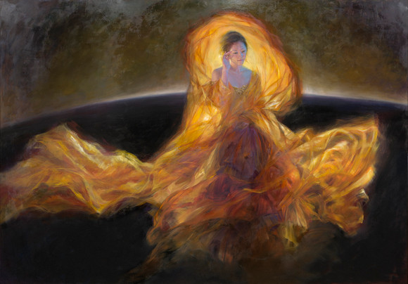 love both the quiet pose and the glowing red against the skin and the light filled 'landscape'