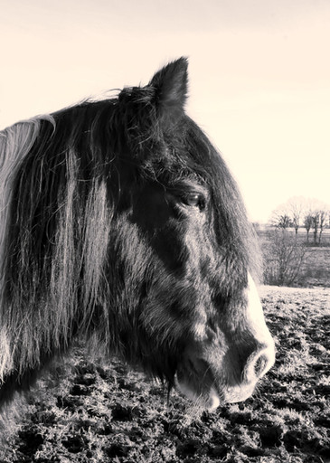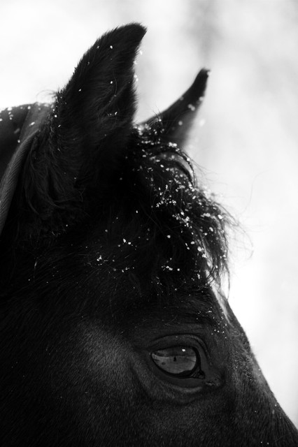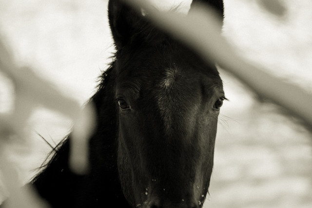 This a simple but quite stunning photograph! The graininess of the film, the sharpness of the fur, and the shallow depth of field creates such a textural visual experience. Not picturing the whole horse's face is a bit unusual but makes for quite a powerful photograph and really enhances the emotional qualities that the viewer projects onto the subject.