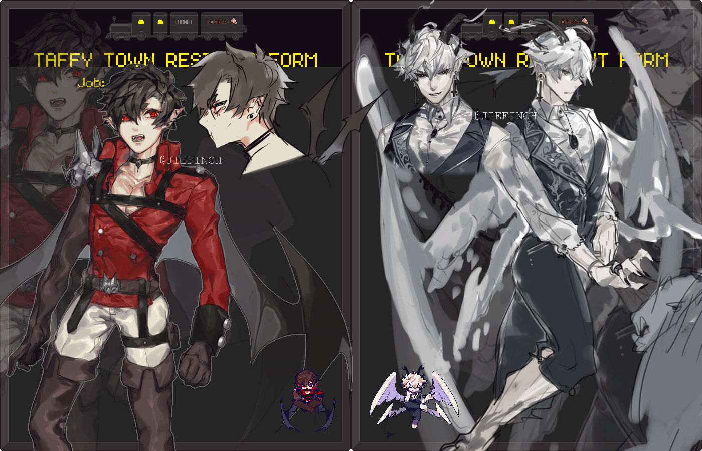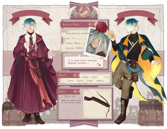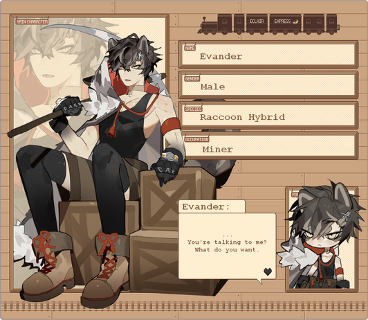 Due to the private nature of his parents and he himself, he confided in no one. Growing used to being alone, he started to scorn others. He moved to the isolated and slowly expanding Toffee Town as a new post under the company he worked at with the promise of a quiet life working from home, only going out to travel for scheduled appointments, which the train served convenient for. First coming in, the accepting nature of the town had shocked him at first, and he felt a sharp jealousy at how free the other hybrids roamed in public. He desperately wanted that for himself. Through struggle, Ried began to learn to come to terms with who he was. Once he gathered his will, he began reaching out again and letting his wings free for once. It was easy after the first big step, and despite his preconceptions, he received many compliments. The few that regarded him with scorn cut deep into his previous mindset, however he was finally regaining himself from his misconceptions. With time, he became as proud of his hybrid attributes as with any of his others and grew a better mentality, smiling much more often and cracking jokes again.