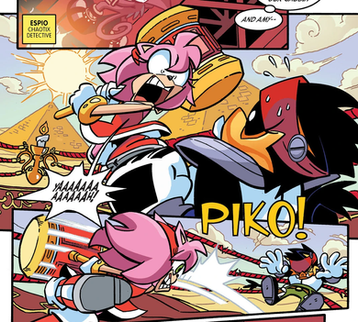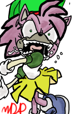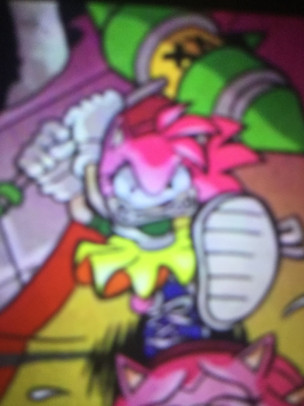 Rosy the Rascal (also known as Anti Amy Rose) is the Moebius counterpart to Amy Rose . Rosy wears a very similar outfit Amy wore when she was younger and carries a hammer similar to Amy's, only green and spiked. Mentally unstable, Anti Amy seeks to attack just about anyone who gets close to her, and constantly haunts Scourge for ignoring her.Info is from the Archie Sonic Wiki.