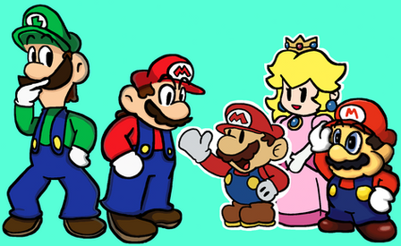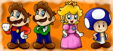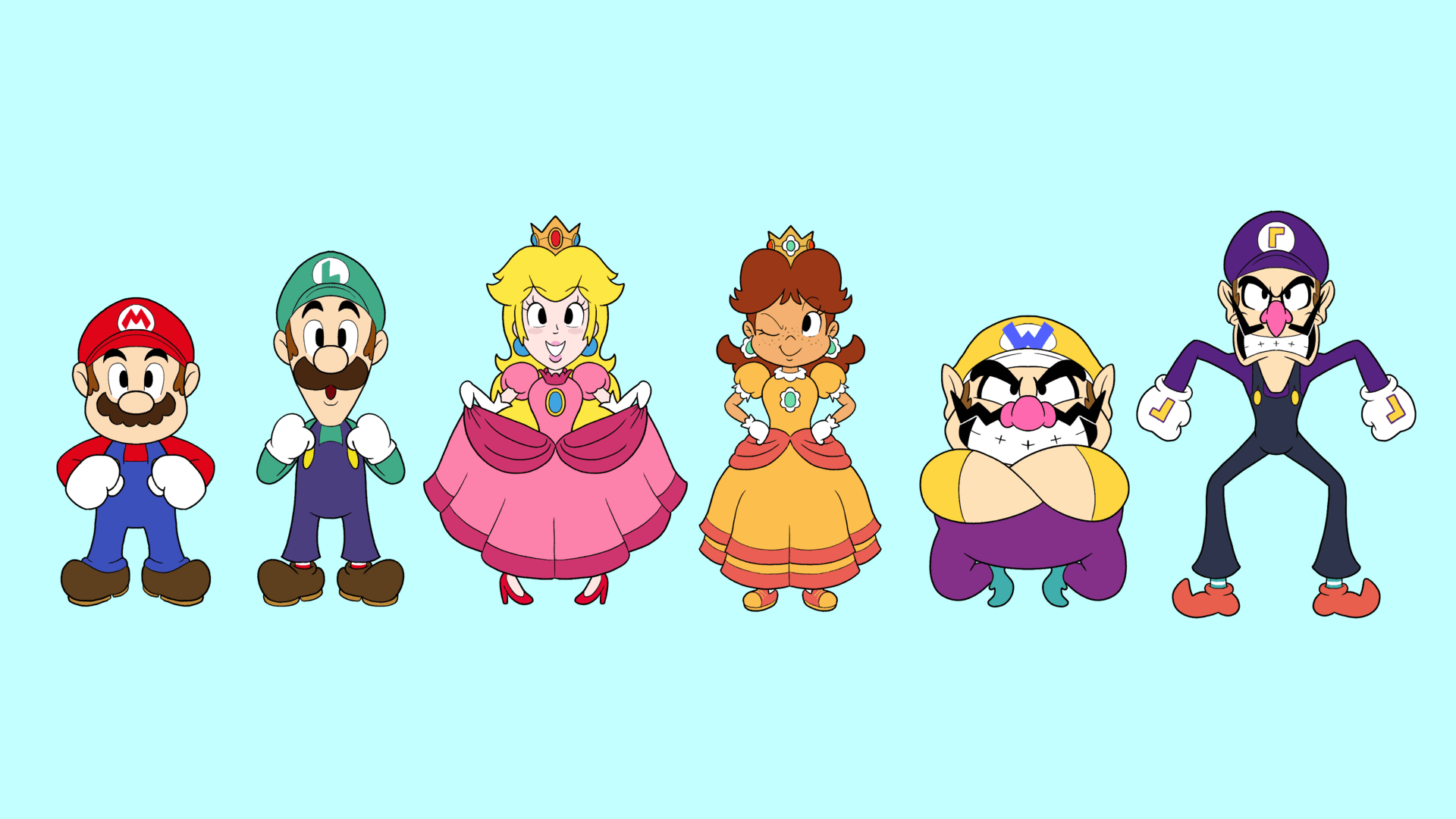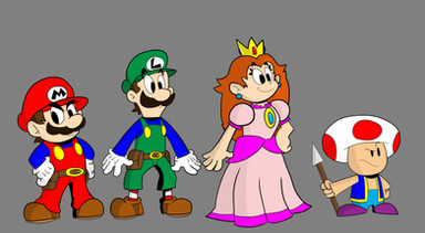 Whoo-ee! Three sets done, three to go!So yeah, when I drew them, I drew Wario and Waluigi smaller than Mario and Luigi in scale, and I drew Peach and Daisy bigger than the plumbers in scale, so I scaled them up and down respectively, which made the princess' lines thinner and the Wa's lines bigger... which I didn't realize until after I inked and coloured them... So yes, notice the line thickness inconsistency and know that I already know about it and do not need to be informed of it, even as a joke...