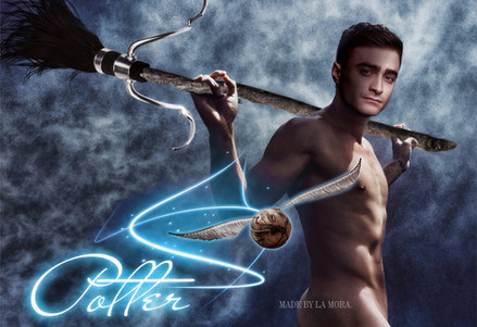 As for Harry, I needed a face with some mystery and quiet confidence (a guy can't look too sweet whilst naked and holding his package), so that was my criteria for that choice. Also, in this manip, it's five years on from Voldie's defeat, Harry's scar has faded and - as happens as we get older - moved more toward his hairline. It's there, barely.