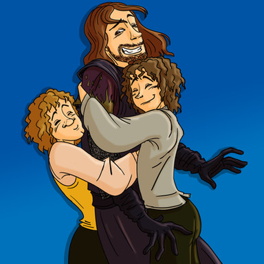 The reason why I drew the characters hugging is because I got a hug from Adam. Pippin is joining in the hug because I could not figure out what else he would do in the picture.