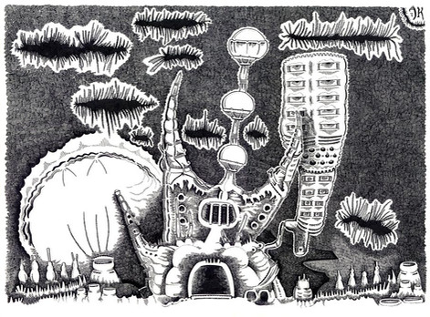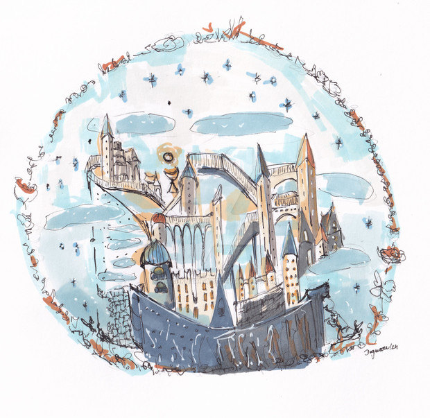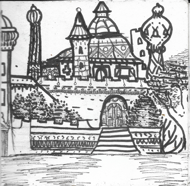 Thanks-Well, it was the first pic I ever drew that was non- realistic/fantasy etc- hadn't drawn in a very long time, and just sort of started drawing lines and then I imagined what Willy Wonka and the chocolate factory meets the magic palace would be like, and I found myself going into magic alcoves and hidden passageways in my mind, and then imagined a magic city and this came out....