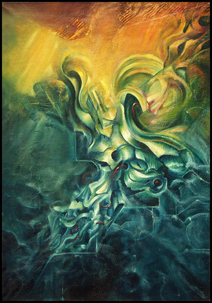 i can't figure out what it is, which is why i like it a lot, though i kind of get scared if i stare too long. could be a multi-headed..something, or a coral or a wierd squid. i'm sorry if i'm totally off the original intention of this painting. i appreciate artists who take time out to make such wonderful works. great job, really