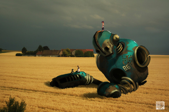 This is my last work on digital (19/02/2016) This illustration is set in a 60's american farm with carefree boy who meets a spacial robotI hope you like it ;D