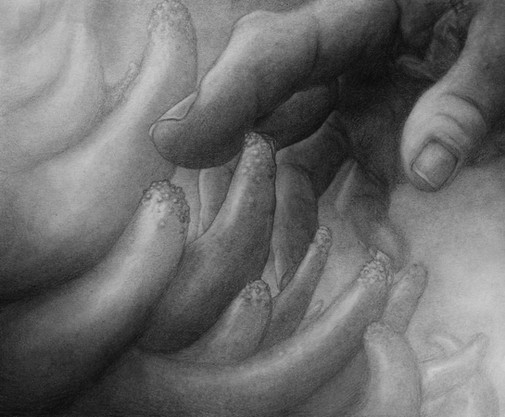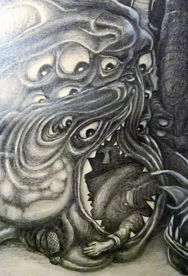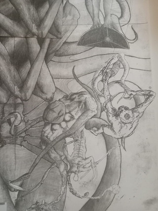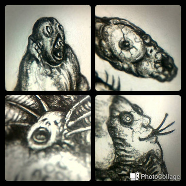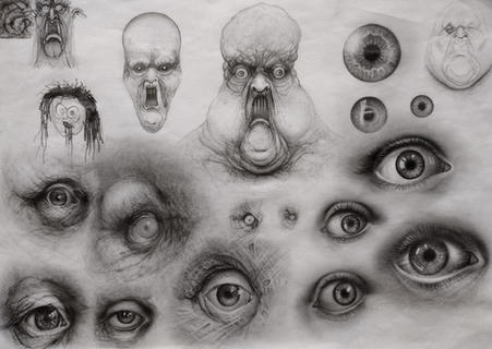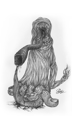 Idiotic blind god of nuclear caos, Azathoth, in not quite its full glory of primal noise and fury. Disordered and distorted fragments of a graphite portrait of this nightmarish lovecraftian cosmic horror. I wonder if these scatterd images are more disgusting / frightening than the complete illustration I will post later.Related content