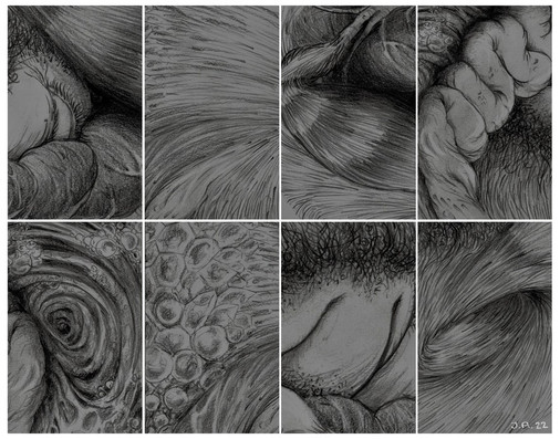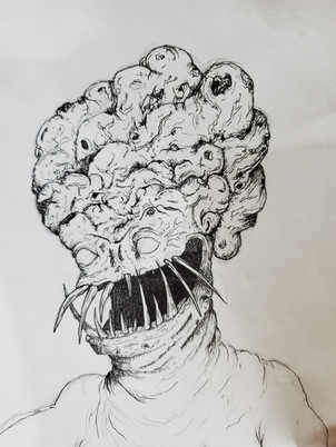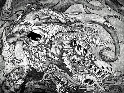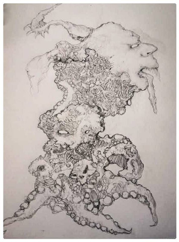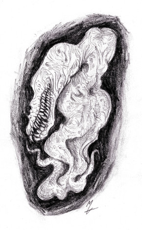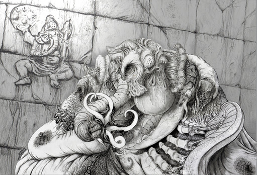 Un intrascendente dibujo a grafito, considerablemente espontáneo pese a que se fue gestando durante a lo largo de dos semanas, en sesiones breves para no perder la paciencia. Lo más tedioso, la simetría. La cuádruple cornamenta intestinal sugiere un apócrifo Ny-Rakath.