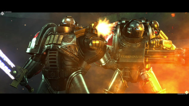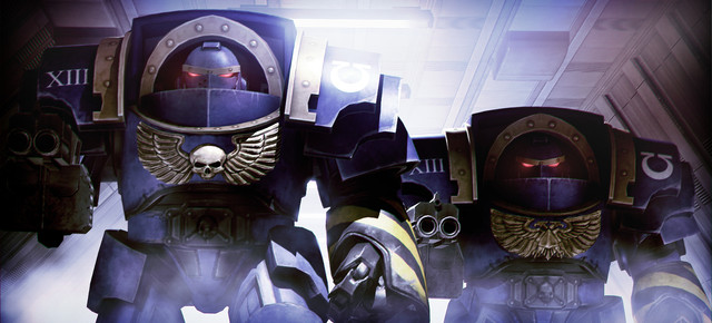 something that could be considered a moving version of this scene is part of the Dawn of War 2: Retribution intro cinematic - only the hammer wielder has lighter armor, the Space Marines are from a different Chapter and there's a lot of red instead of blue.