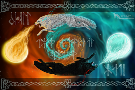 Commission for DelightPrints - another "artist's choice" image!Β Since "yin yang-like" images have proven popular for the company, I suggested we try one featuring Skoll & Hati, the Norse wolves responsible for devouring the sun and moon during Ragnarok.