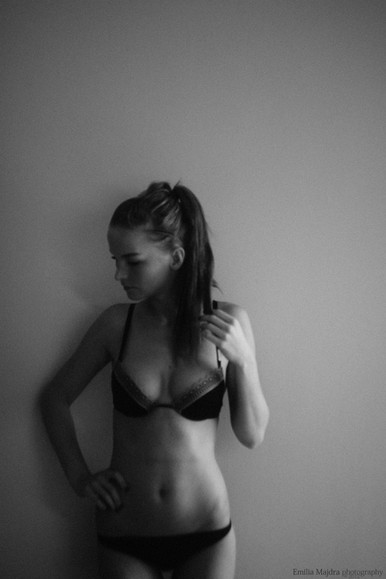 An intimate moment with a lovely model. So cute and feminine! Nicely balanced composition, with the long lines of the model's head/neck, back, and limbs filling the frame and her head in the upper right balanced off against the blank mass of the chair in the lower left. A picture you can linger over!