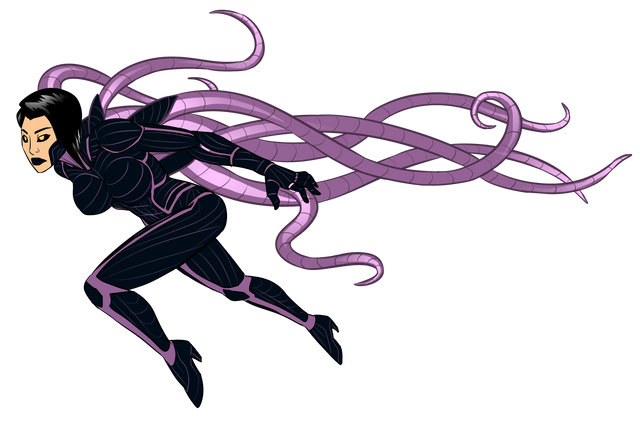 Once, her colleagues called her Lame-iya, she was a low-level super-villain with mediocre shape-shifting powers. Not anymore.Characters don't usually come to me in dreams, but this one did. I had this image of a squirming mass of glossy black tentacles, like something out of H.R. Giger's nightmares. It only lasted a few seconds, but as it progressed, the squirming mass coalesced into a female form and the name came up as if someone else in the dream was supplying it. It's nice when your brain can toss something up like that.