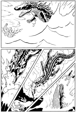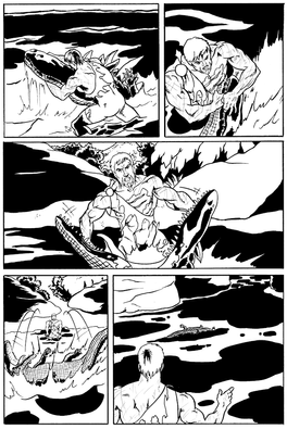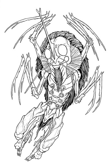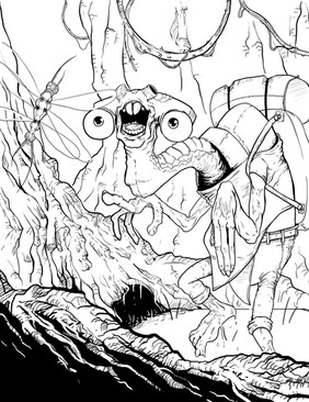 May be, by far, the creepiest creature I've ever drawn. It's a spider-person druid, conjuring up a cyclone of razor-sharp leaves. How do you make a leaf look razor sharp? Cut stuff with it. All the leaves have been stripped from the trees we can see and critters are fleeing the scene. If this was color, all the undergrowth in this forest would be moldy gray or white, since the forest canopy completely blocks the sky.