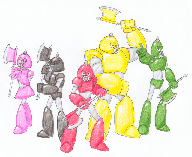 Axem Red, Green and Black each have Megaman Zero's body (from the GBA games). Pink has Roll's body and Yellow has Gutsman's body from Megaman battle network.