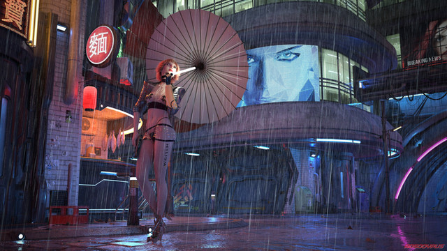 Thank you, The steam is part of the "Urban Future 5" models. The rain is from the "Iray Presets for DS Enchanted Forest". I also applied a frosted glass texture to the Trench coat and it did some interesting things to the cyborg's lights