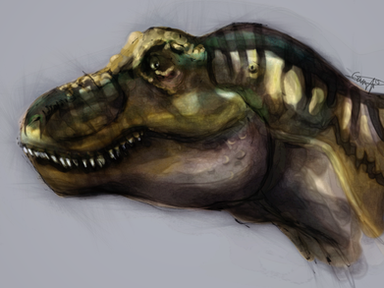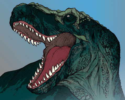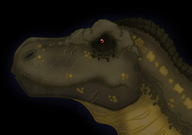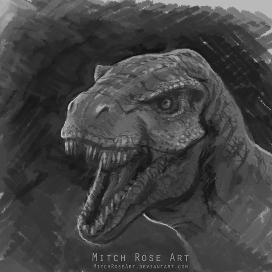 I was fascinated by the various textures usd in this picture. It would appear you know your t-rex. Enlarging the picture to full size gave me the oppurtunity to study his/her teeth-very impressive, and realistic. Glad it's just a picture. I really love how its body fades into the background.Just out of curiousity I would love to see this with a darker background to see if it changes the impact of the image. As for the current background, can't think of anything I would change-except for previous comment. I haven't seen too many monochromatic pictures on DA so when I do see one, it gets my attention. Overall I find this picture most mpressive-great job!