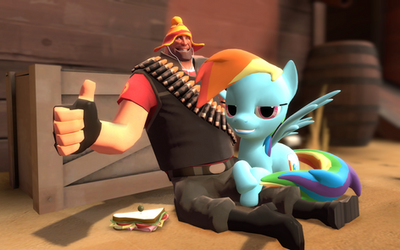 Don't ask why I put Heavy and Fluttershy fighting over da sandvich, with Rainbow Dash and the Medic in the background.