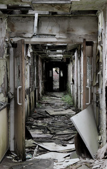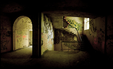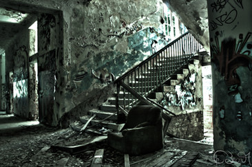 St. Lukes Hospital stairway in the basement.A lot of the photos taken at this hospital had to be lit with a continuously moving flash light, due to the rooms being mainly pitch black. (just putting this out there on every photo in case I get some comments about weird light spots). This is one of them.