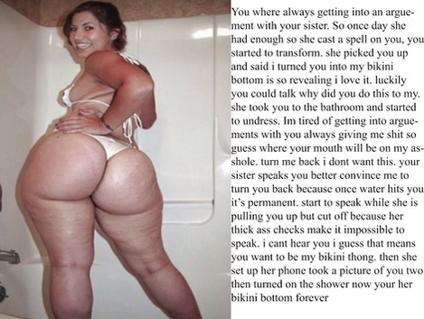 Wow! Is she ever hot! I like the idea of the girl "suffering" as the other girl's bikini bottom. You could even have the perspective of the bottom looking up at the girl in humiliation when she slips her down to her ankles and sits on the can...