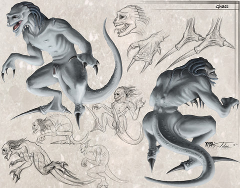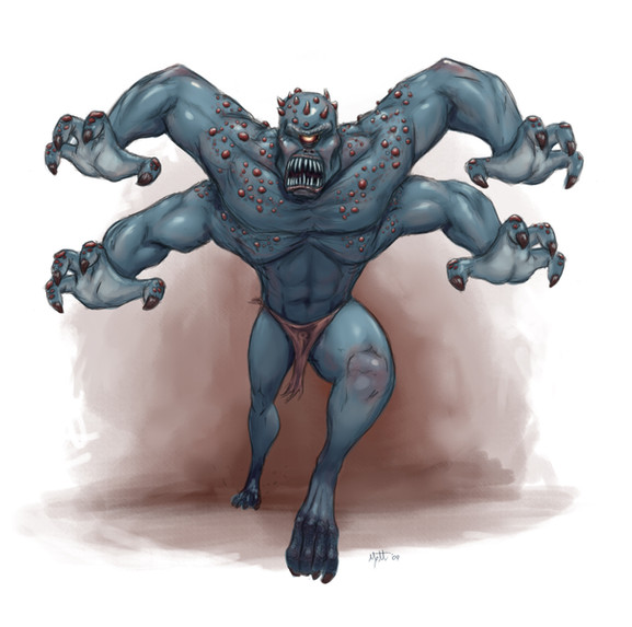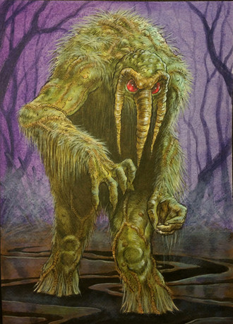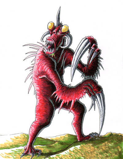 My version of the D&D monster known as the slaad from the toad-like race of chaotic outsiders called the slaadi. There is no "orange" slaad in the original game though I was inspired by some images of a hezrou demon (the two can be very similar) and created the orange slaad. The creatures are all mouth and noise and annoying even to other slaadi.The slaadi are copyrighted by Wizards of the Coast and Dungeons and Dragons.