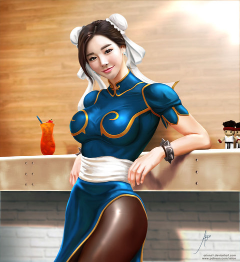 The famous Chun Li, playing games, recovering from her wounds after another Street Fighter tournament.