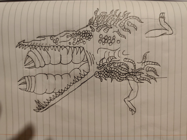 this is deformaty an experiment in the game i wanna make nd the more complete version of abomination as this one can move much more easily cause rather then dragging itself around it wriggles lik a worm or snake.it is much more visious as well using the same multi mouth trick of its predacessor. its arm is a short sword helicoptor blade combo. so it can impale nd slice thru things with ease