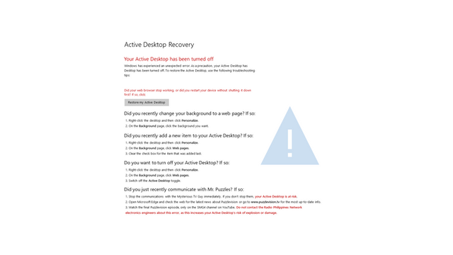 I don't know if this screen still shows up in Windows today, but some of you might remember it (under the assumption you've run Windows before). I think this was a Win2K thing. Anyhow, I made this quite a while ago and thought to share it with any who were interested. Click the "Restore my Active Desktop" multiple times to see what happens. It makes for a decent prank, I think.In order to make this into a desktop, you may have to download it to hard drive and make an html in the same location. Windows ought to be able to load html's as desktops. Anyhow, you can save a copy of the aforementioned page here: [link]