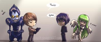 First off, my apologies to the rabid Death Note haters. If you have to complain about the times, please do so elsewhere - I sincerely doubt I possess the power to destroy fandoms at request.EDIT: Of course, considering that Death Note doesn't have a large market over here, the fanbase is probably small enough to not give rise to a significant antibase. Ah, never mind then.
