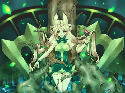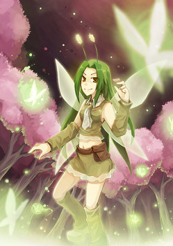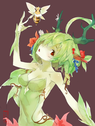 Enka (炎花) is a fire flower, which is probably closer to "fungus fairy" than actual flower. She normally floats over the woodlands looking for dead or overgrown stems and branches, attaching herself to them when found (thus giving her the appearance of a flower). She then spreads her incandescent hyphae through select parts of the plant to consume it over the course of the next several hours. When her task is complete, she twists off from the charred plant matter (which then crumbles apart) and floats away to repeat the cycle.Enka's flowerlike appearance coupled with the scent of heated sap will often attract the unnecessary attention of bees. "I'm not a flower! Go away!" Enka will say. "Are you sure? I just want to help!" the bee will reply. "Yes, I am sure. I'm closer to 'fungus fairy' than anything else," explains Enka. "But you smell like a real nice flower, though!" insists the bee. And they will argue like this for a while until Enka starts swinging fire at it to drive it away, only to be visited by another bee with the same questions. The bees are very persistent because they really like that smell, and they also really like Enka but are too shy to say it. Actually, it might be the same bee that returns, pretending to be a different bee.