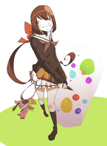 Momiko is a character I made about a year ago, taking her name from Akari's nickname ("Momiko" = "Momiage" (sideburns) + "Ko" (child / girl)). Her armlessness is ripped off from x6suke's armless-robot-chan . I had been making a game starring her, but the play mechanics were kind of complicated and unintuitive, and I eventually got distracted by another idea.