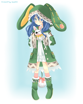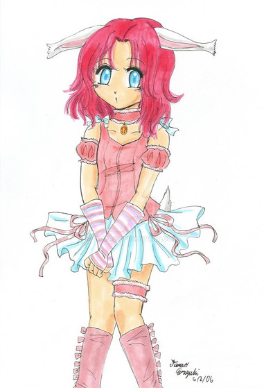 aww, you shouldn't bash your art like that, I think it's pretty. ^^ You did her hair so wonderfully and windblown *-* If you practise more with coloured pencils maybe you will like it Hehe.. bunny ears!!!!!