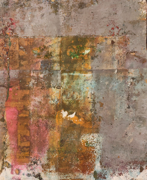 Previously a bright painting, this relic-like work referencing old weathered walls and how Rome has been in a state of cyclical flux through history with social transformations, good periods, bad periods, societies decaying, new ones born etc. Covid lockdowns deeply affected my art -making me think how fragile society is and could collapse. It made me think how places are in a state of flux throughout history, and Rome was hit by a series of social transformations seeing the rise and fall of the empire, plagues, poverty, then society healed itself, then went to war etc and carried on in this cyclical way.