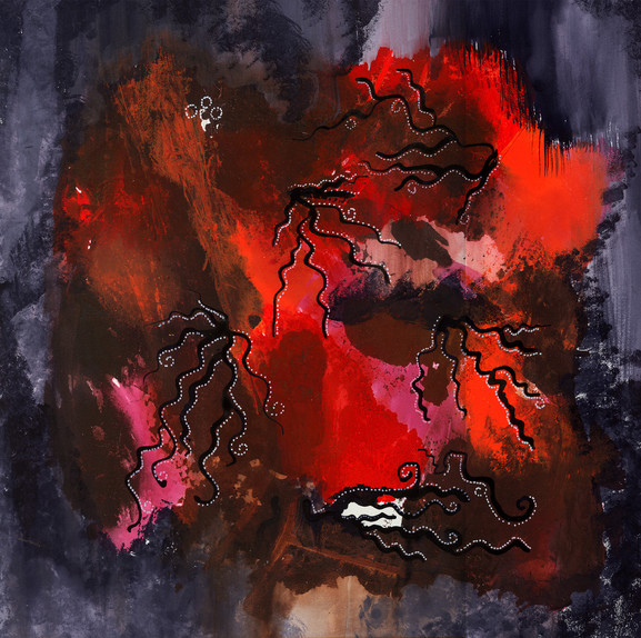Contemporary painting: Red fluid.work made with a knife using acrylic paint (Pébéo-Studio) and Posca (Uni) on a wooden frame covered in cotton (100% cotton).