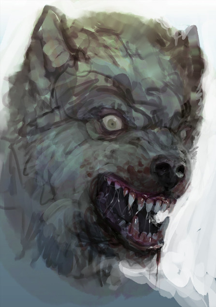 Looking back at this, I like how the wolf builds over the person. The wolf skin covers rather than the human skin getting torn off.