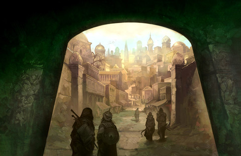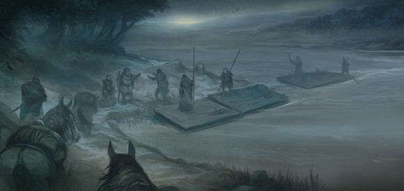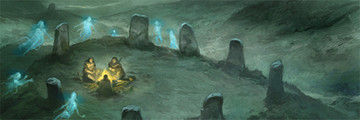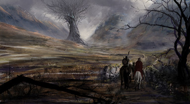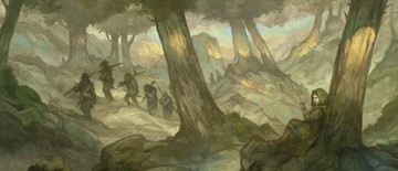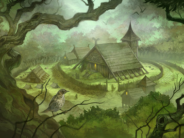 A chapter opening spread for BEOWULF Age of Heroes from Handiwork Games.The Hero and their followers investigate a sacred grove.