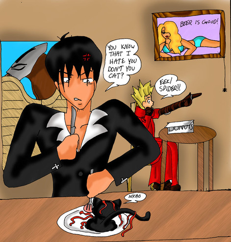 Hahahahahah! Vash's... face! Hahahah! See what eating too many donuts gets you?! I love it that Spike always gets involved with the donuts somehow... really! Go see your Spike/Vash pictures, jono, and see how many contain donuts...
