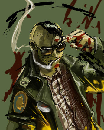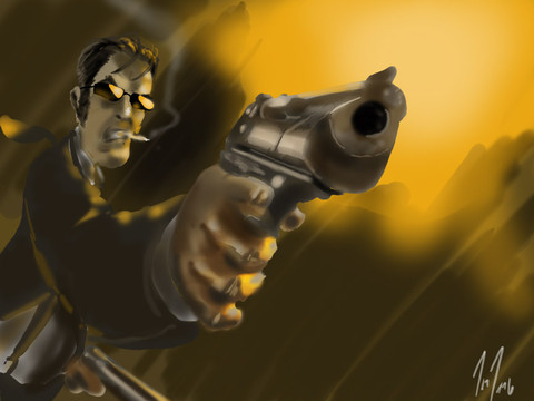I absolutely love the angle of this work. It's as if there were a person with a camera looking up at him and it's nice how his gun has that out-of-focus look to it.