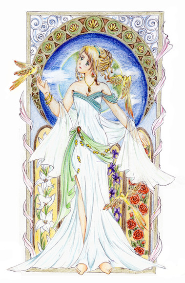 By chance did you get inspiraton from the works of Mucha ?? °w°