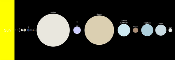 "Minerva is an arid planet that has the same conditions to Mars, albeit larger, cooler, and has an extensive ring system. It has 2 moons; Elara and Thebe."