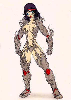 My idea here was to attemp to design those legs, because 1) I'm not too keen at drawing them, and also I had no idea of how to design the lower part of the picture. Initially, my idea was to give the armor a somewhat "knight-ish" style, with a huge sword and a shield, but for some reason that always ended looking weird at the bottom, legs too small, too simple. For some reason, adding those tendrils and tentacles in the shape of an undercape gives some harmony to the picture, so I suppose I'll be exploring that possibility if I'm not able to make the legs bulky enough without turning her into a Megazord. <_<
