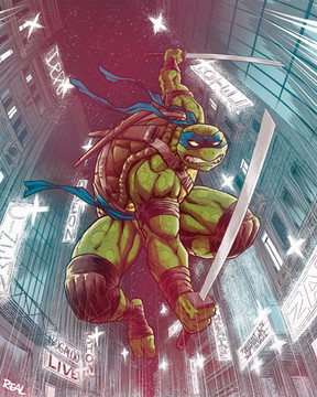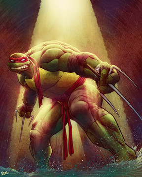 There's so much to like about this piece! The detail is great and so is the color palette. The mood is dark but energetic. Objectively, it's just a really good composition. But on a more personal note - I usually don't like how Splinter is drawn by anyone - but I think he looks really good here! Old but not decrepit. Full of lots of "old man strength."