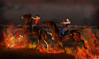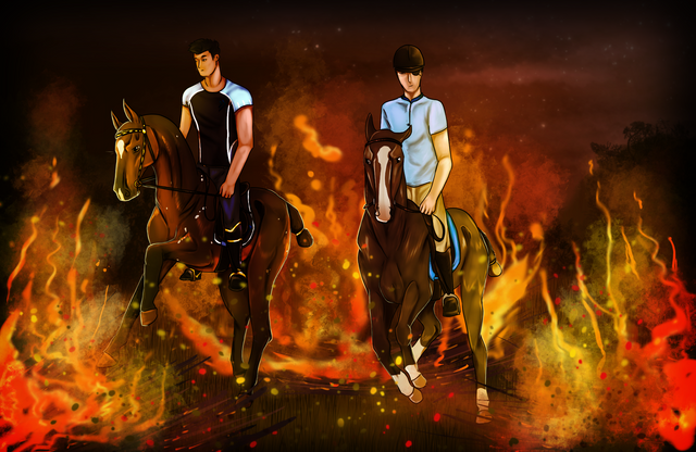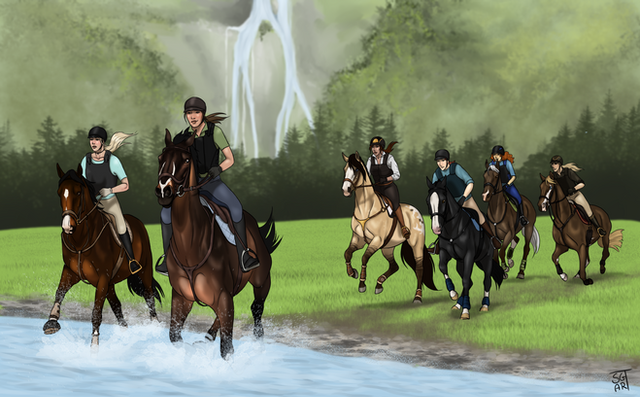 You can really see the characters' moods in their poses, Daniel and James have upright posture with alert horses and seem energetic, and Drum just bleeeh with his unbuckled bridle and Rebecca a bit more slumped... great work. And a lovely sunset <3